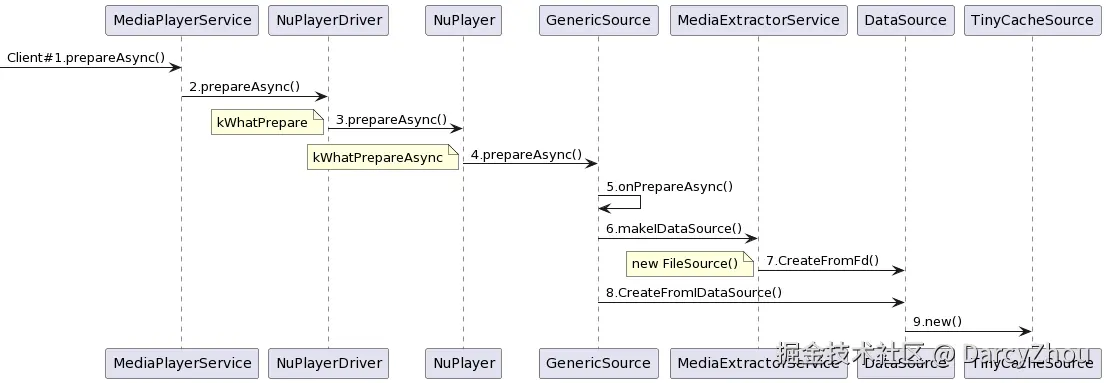MediaPlayer播放音视频时,首先是setDataSource()方法设置数据源到GenericSource,然后是执行prepareAsync。java层调用的prepareAsync()方法最终还是要回归到MediaPlayerService中的Client中,整体流程如下: