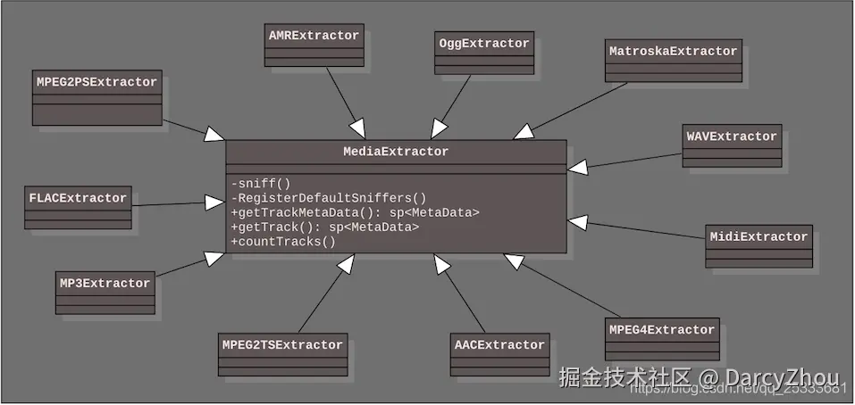 在RegisterDefaultSniffers先将不同格式的嗅探器进行注册,然后再使用sniff()方法对媒体输入源进行文件头的读取,根据文件头内容嗅探出需要什么样的解封装组件,也就是不同的MediaExtractor实现。MediaExtractor有大量的实现,分别针对MP3、AAC、OGG、WAV、MPEG4等格式输入的解封装操作。如下常见的一些实现: