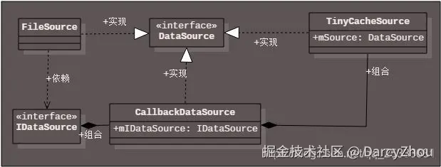 CallbackDataSource:实现了DataSource接口(实现关系),但它的私有字段mIDataSource中,保留了IDataSource(服务端DataSource)的引用(组合关系),让Client端程序可以回调到server端的DataSource对象,从而具备了”回调“功能。