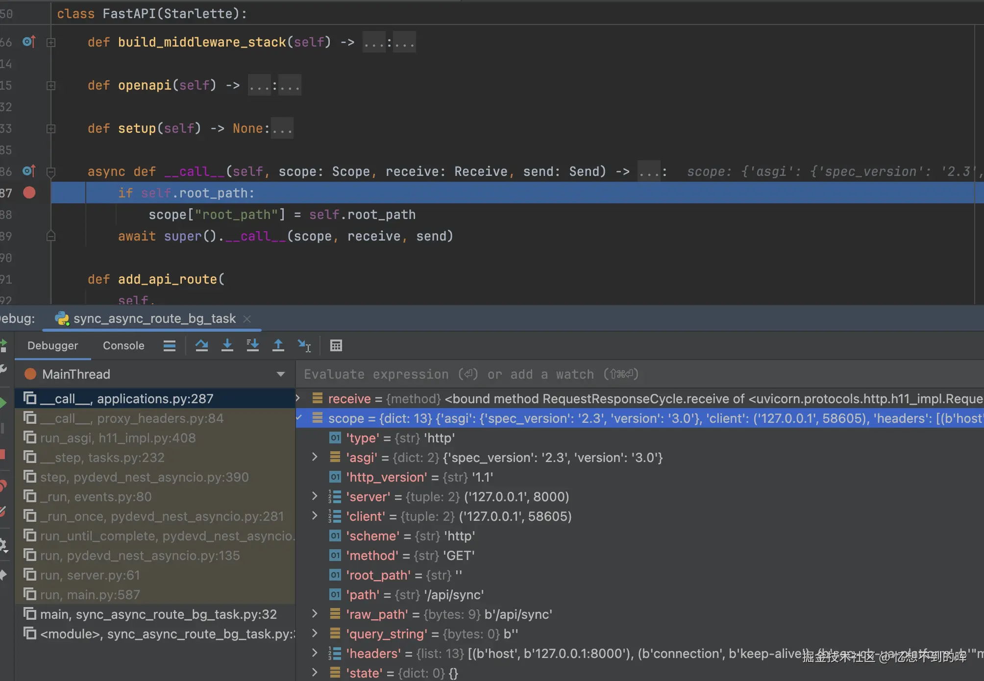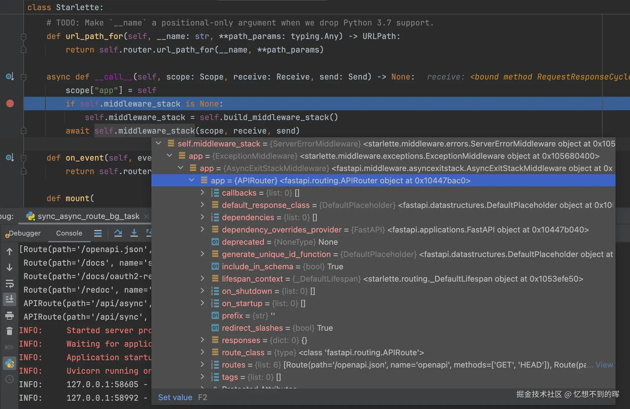 这是 fastapi 应用启动时,初次调用了下 app() => __call__() 方法用来初始化一些东西,其中就包括 middleware_stack,运行程序时断点就会进来(可以看 unicron.run 的源码),此时 middleware_stack 就是 None 走 build_middleware_stack 进行构造。