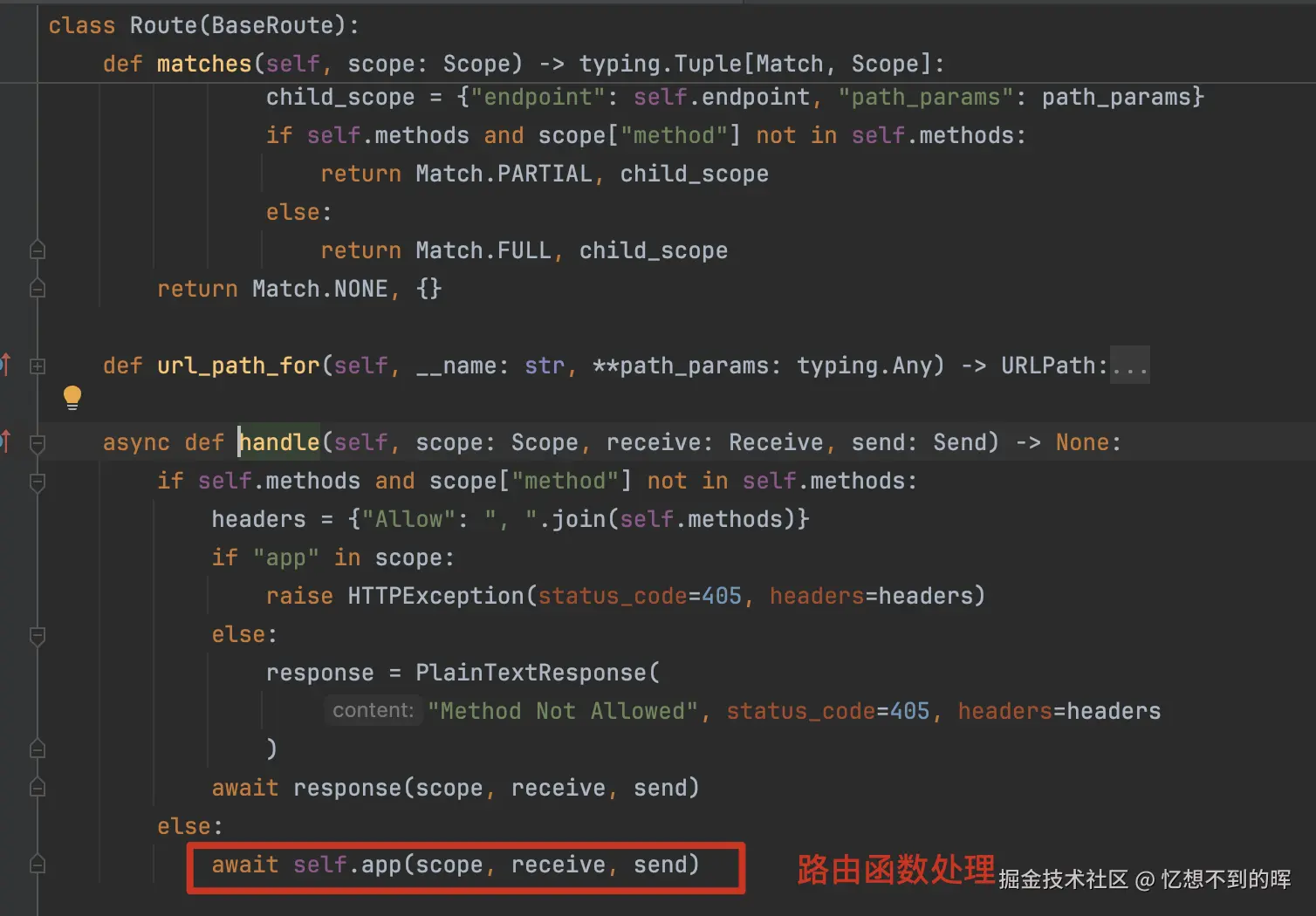 await route.handle(scope, receive, send) # 匹配成功进行路由函数调用