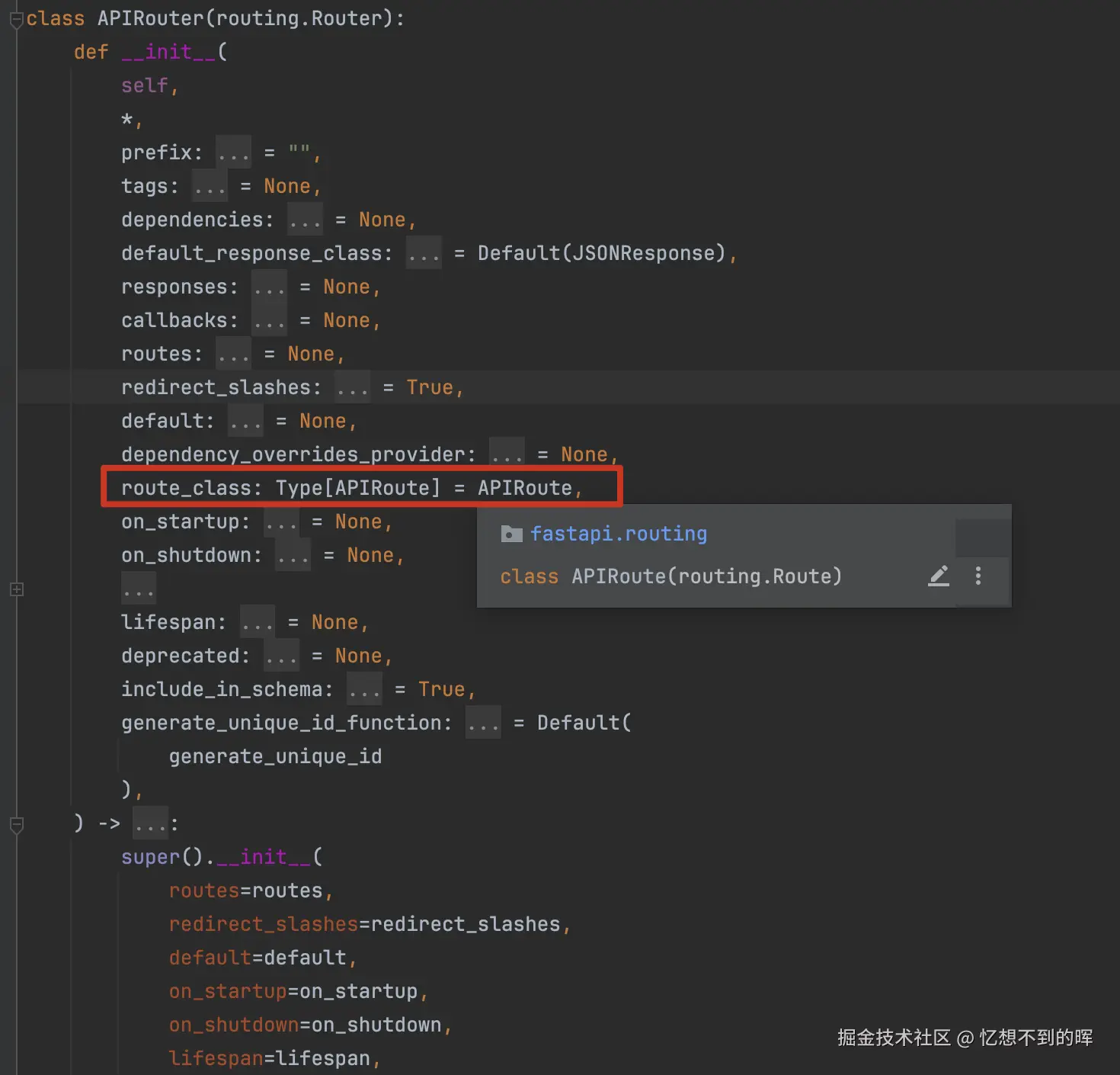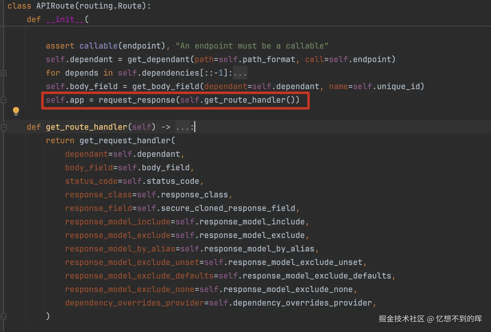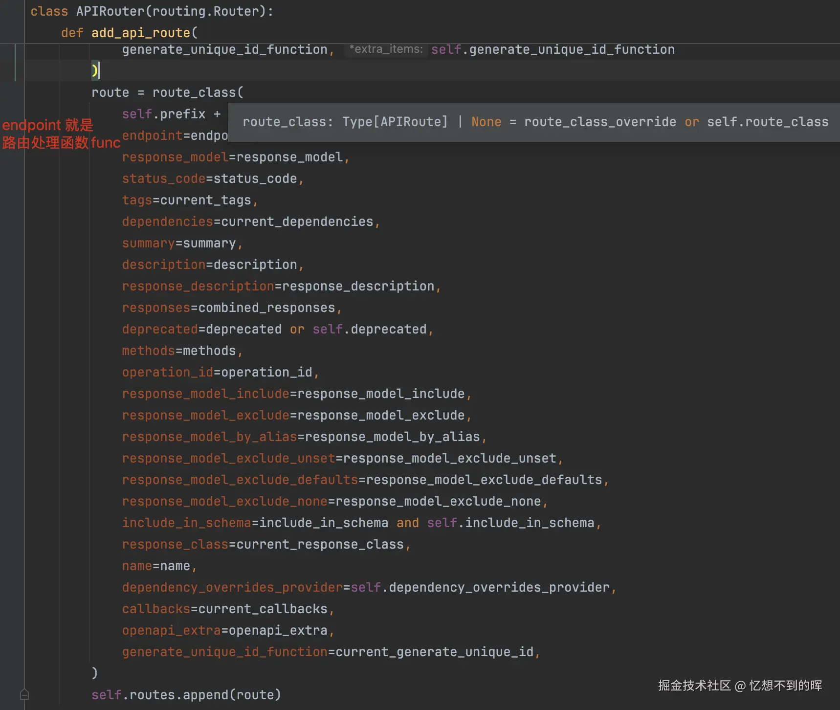endpoint 参数就是路由处理函数、route_class 默认就是 APIRoute 类。最后添加到 routes 列表中。这就是路由注册的整体逻辑。