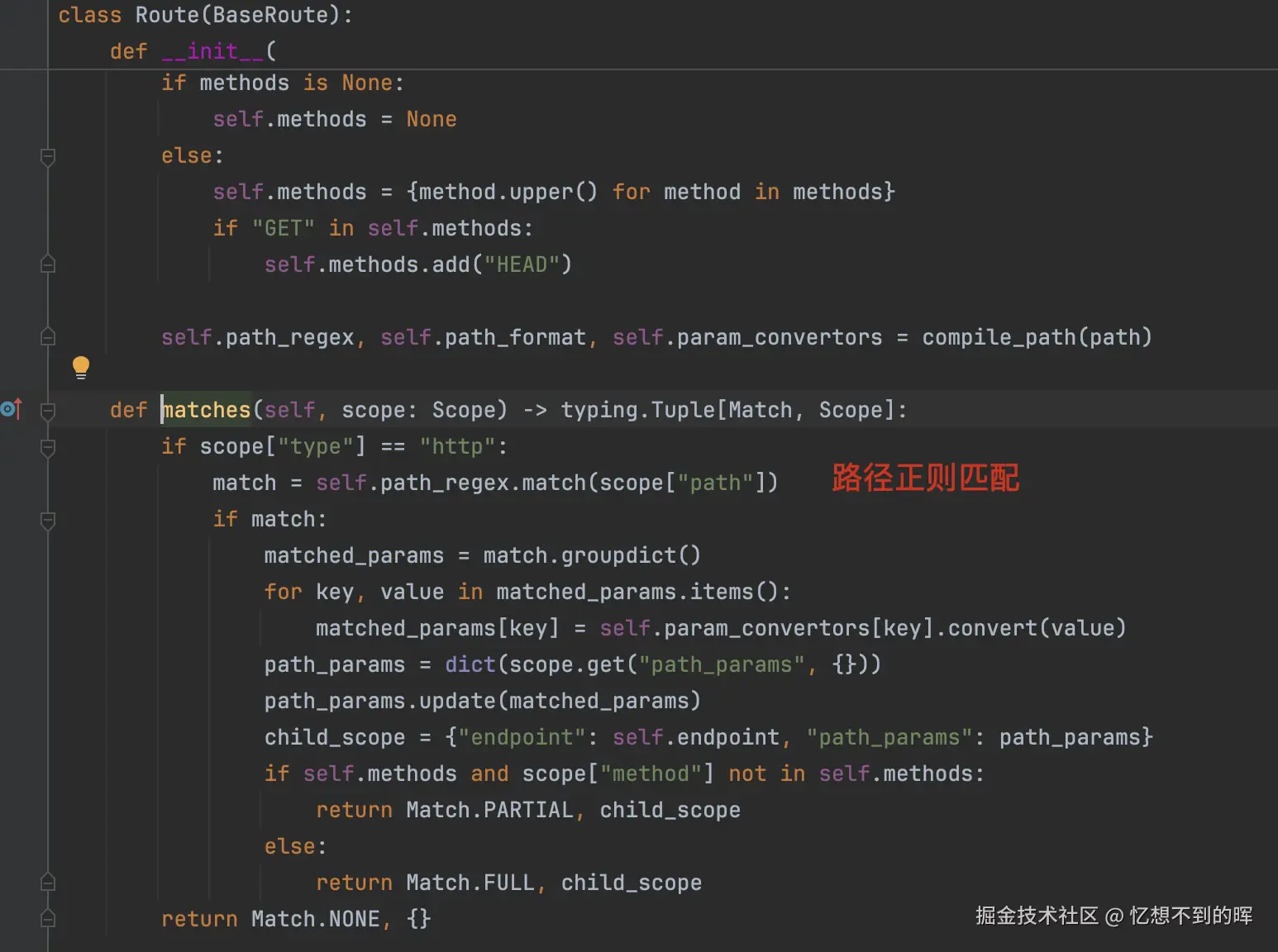 当一个 HTTP 请求到达时,FastAPI 会遍历其 routes 列表,依次匹配请求的路径和方法。FastAPI 的路由匹配是通过 Starlette 提供的 Routing 组件的 matches 方法来实现的。