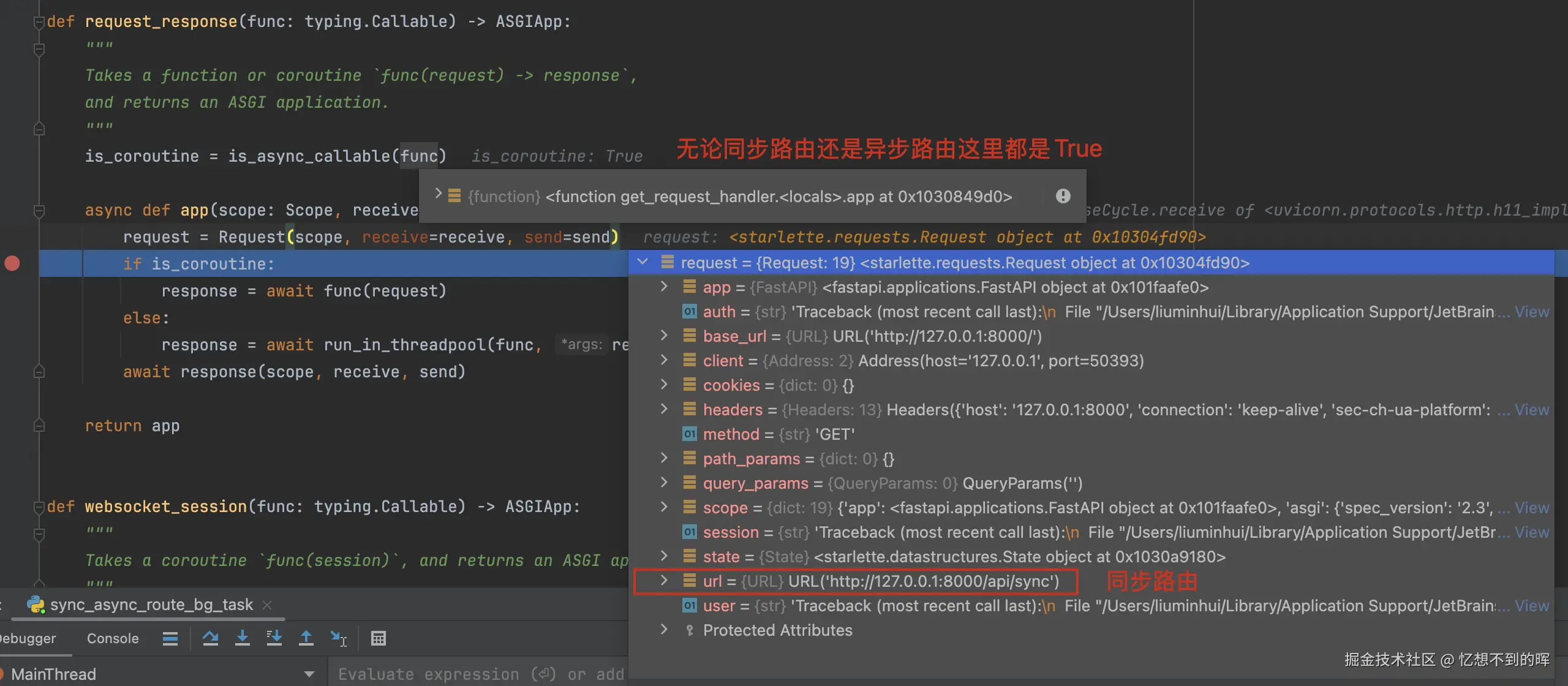 通过 asyncio.iscoroutinefunction(dependant.call) 来进行协程(异步)函数判断,dependant.call 引用的就是路由处理函数。最后执行路由处理函数 run_endpoint_function