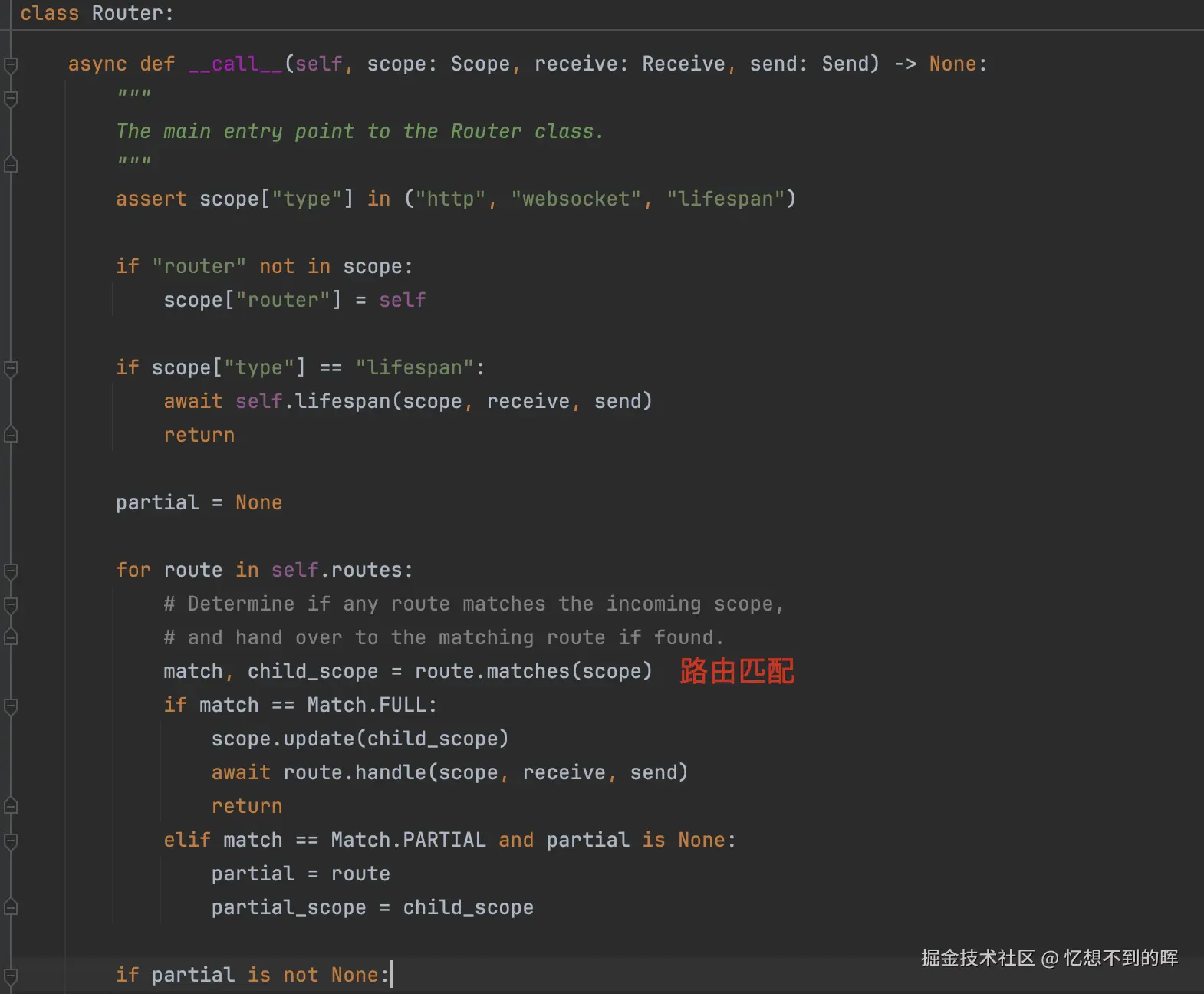请求过来都是按照顺序依次走中间件的调用栈 self.middleware_stack(scope, receive, send) 最后走 self.router()也就是 APIRouter.__call__() FastAPI 源码并没有重写这个方法则是调用父类 starlette.routing.Router 的 __call__