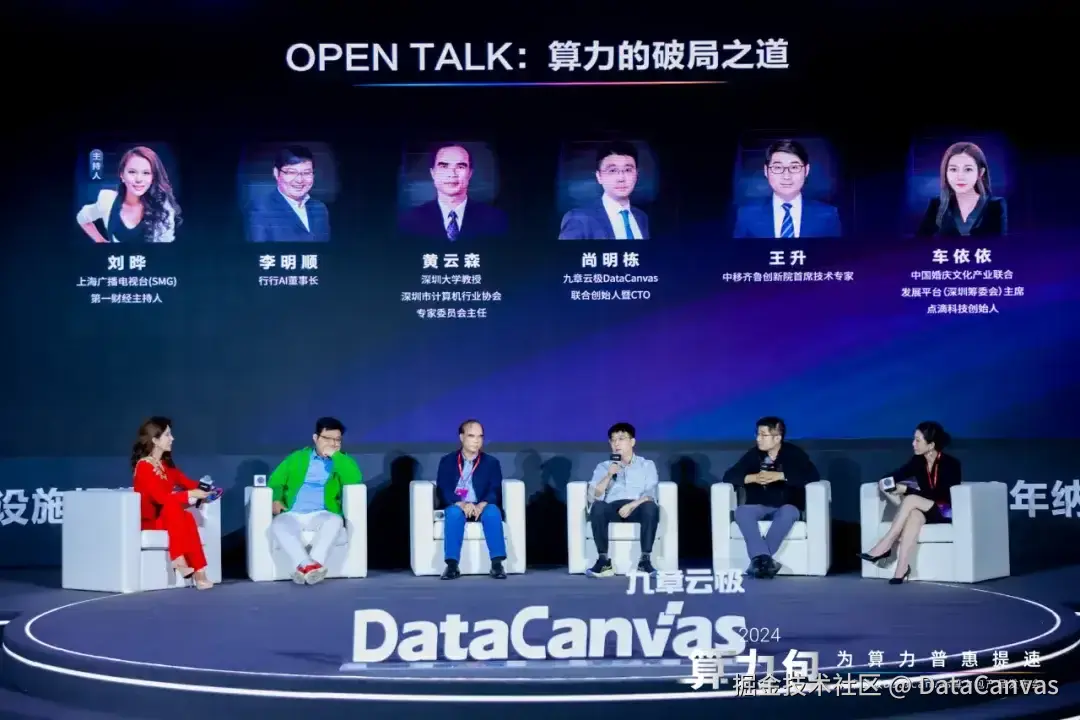 算力的未来需要共谋共举,一场探讨算力未来的圆桌论坛将发布会推向智慧高地。本次圆桌论坛由上海广播电视台(SMG)第一财经主持人刘晔担任主持,邀请九章云极DataCanvas 联合创始人暨CTO尚明栋,深圳大学教授、深圳市计算机行业协会专家委员会主任黄云森,行行AI董事长李明顺,中移齐鲁创新院首席技术专家王升,中国婚庆文化产业联合发展平台(深圳筹委会)主席、点滴科技创始人车依依等行业大咖,从产业多方视角出发,碰撞“算力的破局之道”。