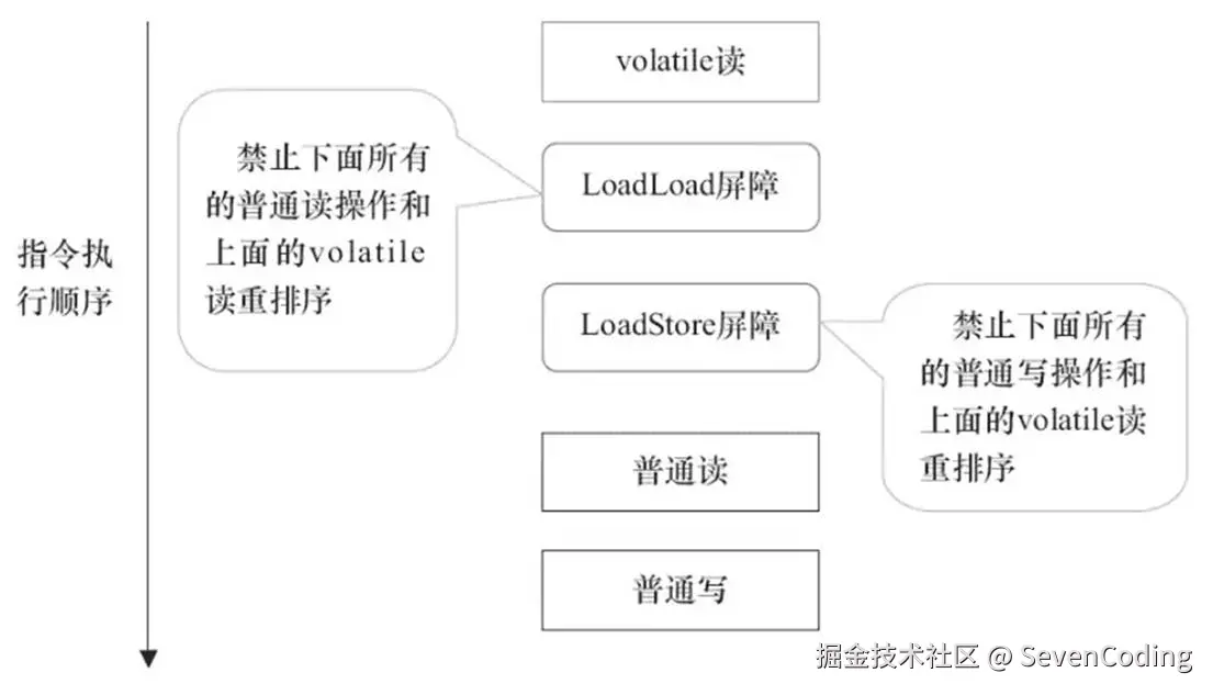 - 每个volatile读后插入LoadStore屏障。禁止之后所有的普通写操作和volatile读重排序;
