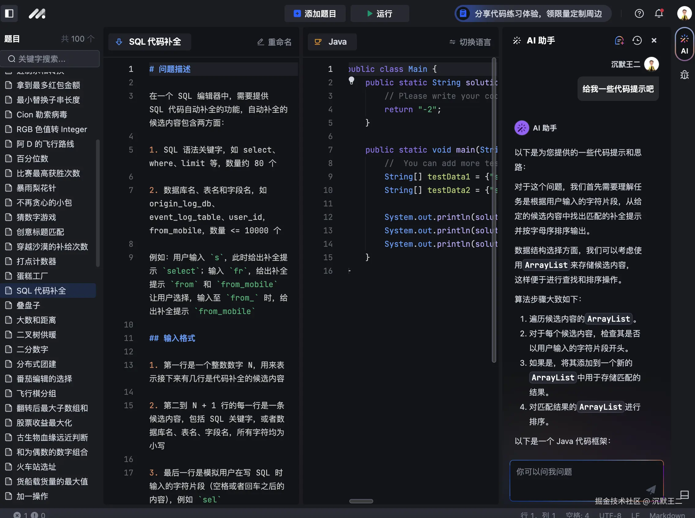 我觉得非常关键的一点是,豆包MarsCode 不会直接给出答案,他是陪伴式的,会一步步给你解题思路,比如说这道“SQL 代码补全”,你完全没有思路。就可以点击 AI 助手中的“给我一些代码提示吧”,他就会乖乖地给出解题思路和代码示例。
