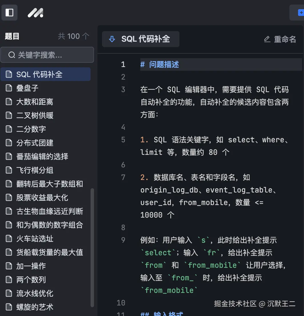 刷题主界面分为左右半区,左半区是题目列表和题目描述,目前已收录了 100 道大厂真题(未来还会继续扩充题库),基本上能应付大多数公司的笔试题目了。