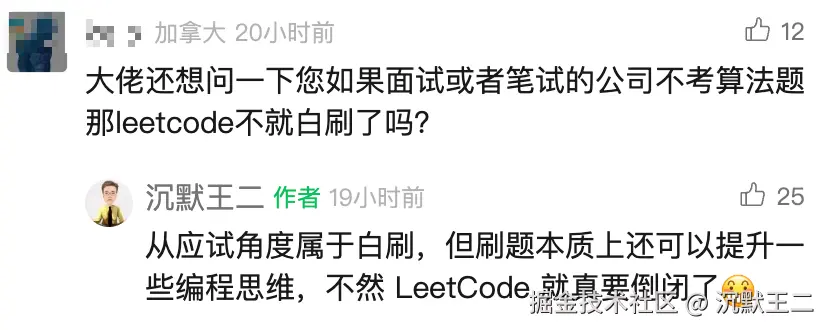 前天的文章留言区有位读者提问说:“如果面试或者笔试的公司不考算法,那 LeetCode 不就白刷了吗?”