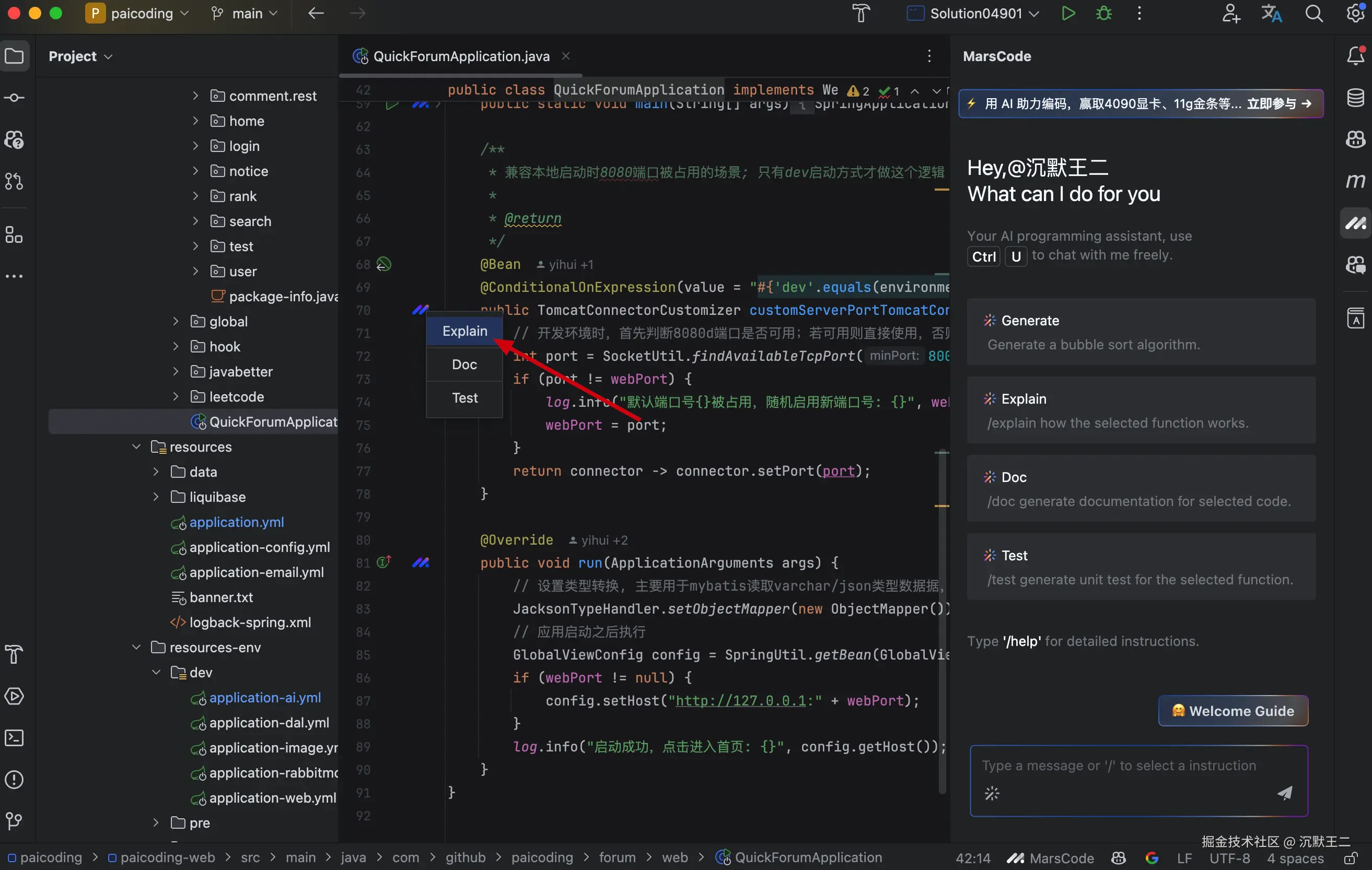 比如说技术派的启动类中有这样一个方法 customServerPortTomcatConnectorCustomizer,你想知道他是干嘛的,就可以点击方法上的豆包 MarsCode 小图标,然后点击 explain。