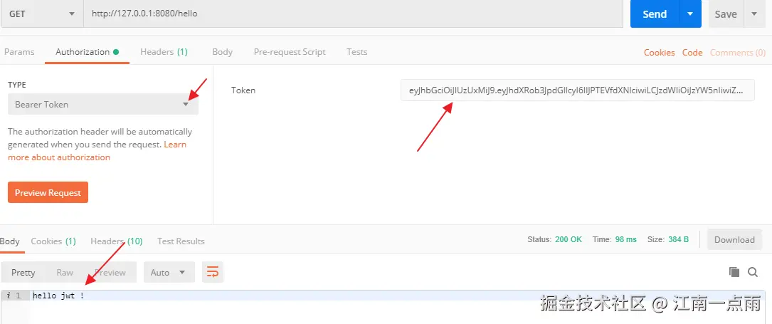 接下来再去访问 /hello 接口,注意认证方式选择 Bearer Token,Token 值为刚刚获取到的值,如下: