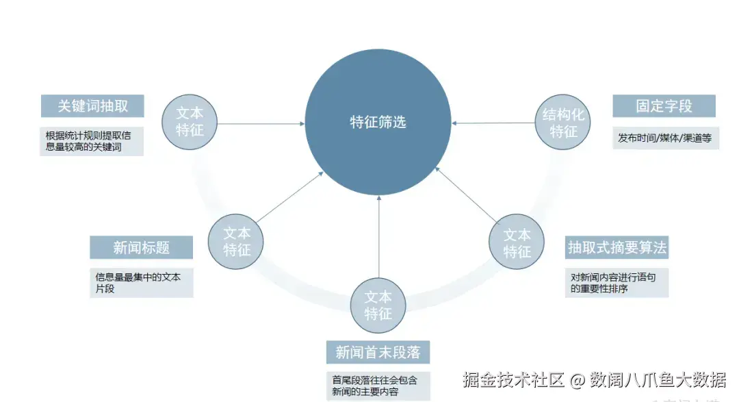 特征筛选则是根据业务需求,针对性地对特定内容进行提取,以得到后续模型或算法聚焦与关注的特征,对于新闻数据,通常可以分为以下几种:
