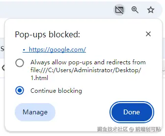我们在平时开发中也会遇到这个问题,例如点击按钮下载一个文件,接口通过指定 Content-Disposition 或者 Content-Type 等方式,让浏览器打开一个新窗口并指定接口 URL 即可直接下载文件。但是获取文件的 URL 可能需要先调用一个接口去获取,但是这个接口耗时好几秒才返回结果,这时我们打开新窗口就会被浏览器拦截,在浏览器右上角会弹出提示: