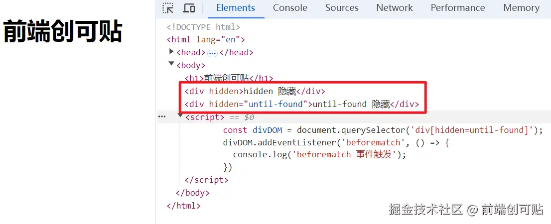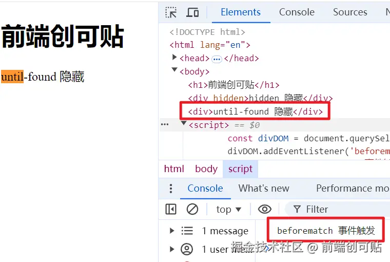 可以看到,hidden 属性自动消失了,并且触发了 beforematch 事件。