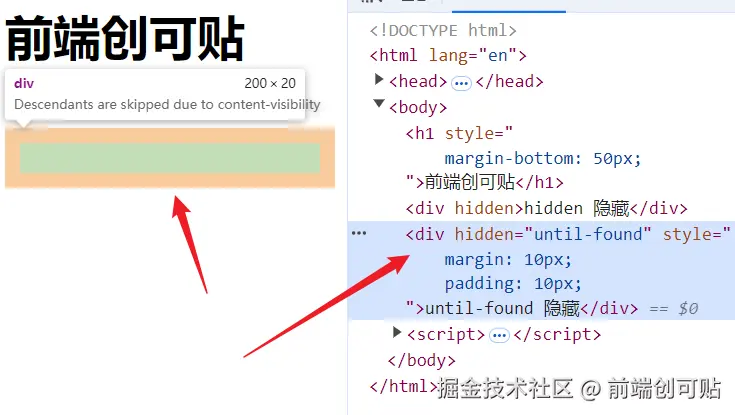 在页面搜索 until-found 状态元素之前,元素是隐藏看不到的,并且有 hidden 属性,当我们通过浏览器的页面查找 until-found 状态元素后: