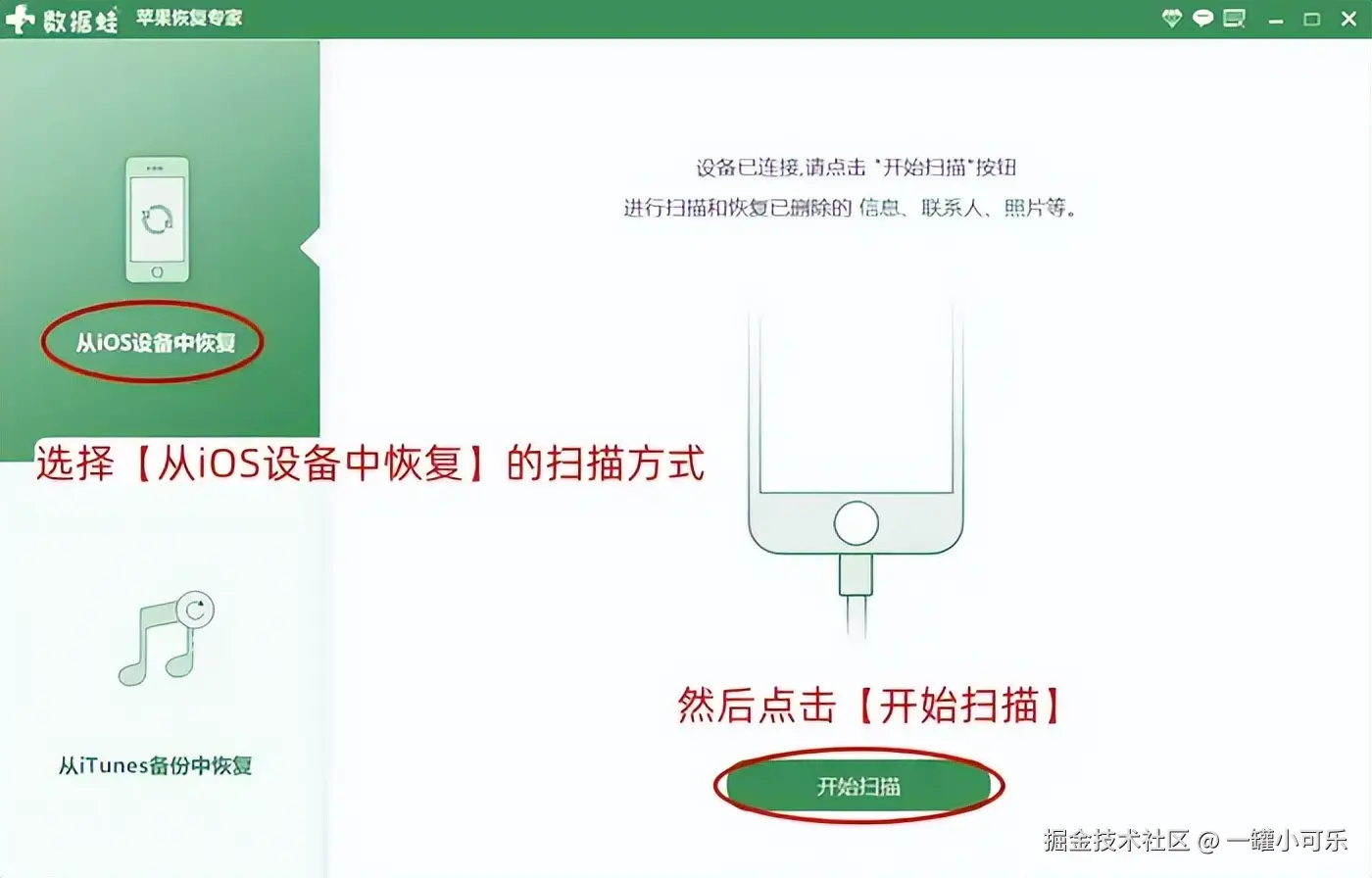 步骤1:用数据线连接手机和电脑,选择 【从iOS设备中恢复】 的数据扫描方式,扫描手机中可恢复的数据。