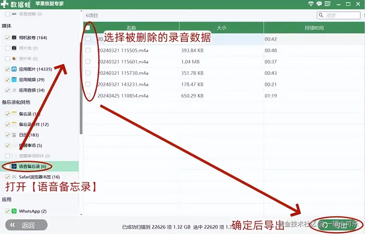 步骤3:点击 【语音备忘录】 ,选择被删除的录音数据,选择完毕后点击界面右下角的 【导出】 按钮即可。