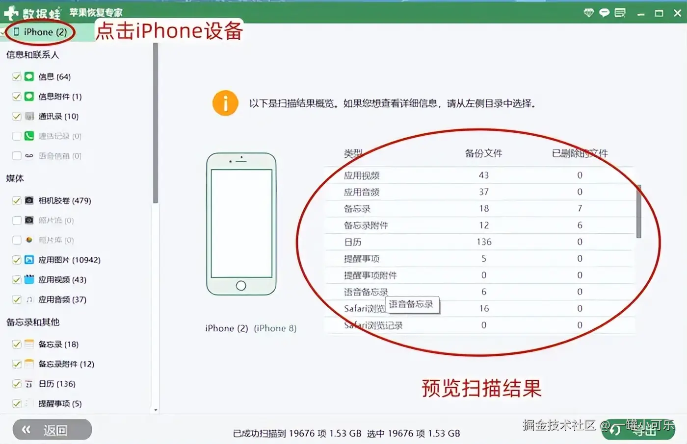 步骤2:等待数据扫描,点击iPhone设备,查看手机总体的可恢复的数据,并查找手机录音数据。