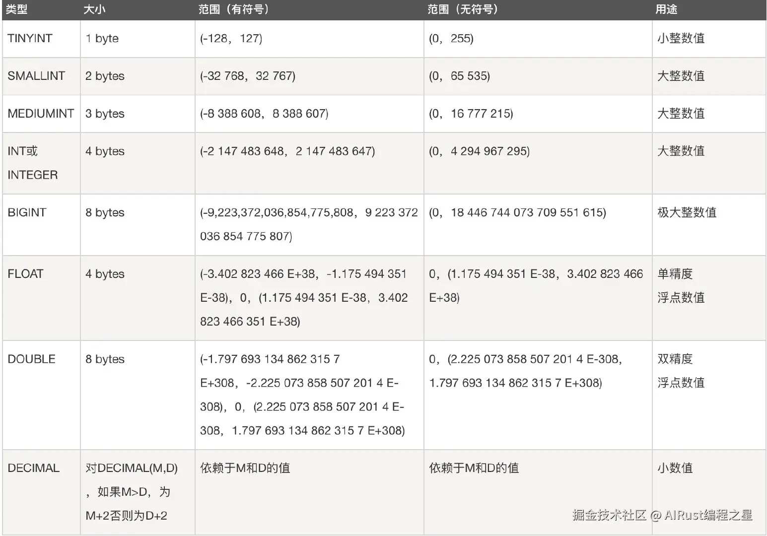- 浮点数类型:FLOAT、DOUBLE、DECIMAL