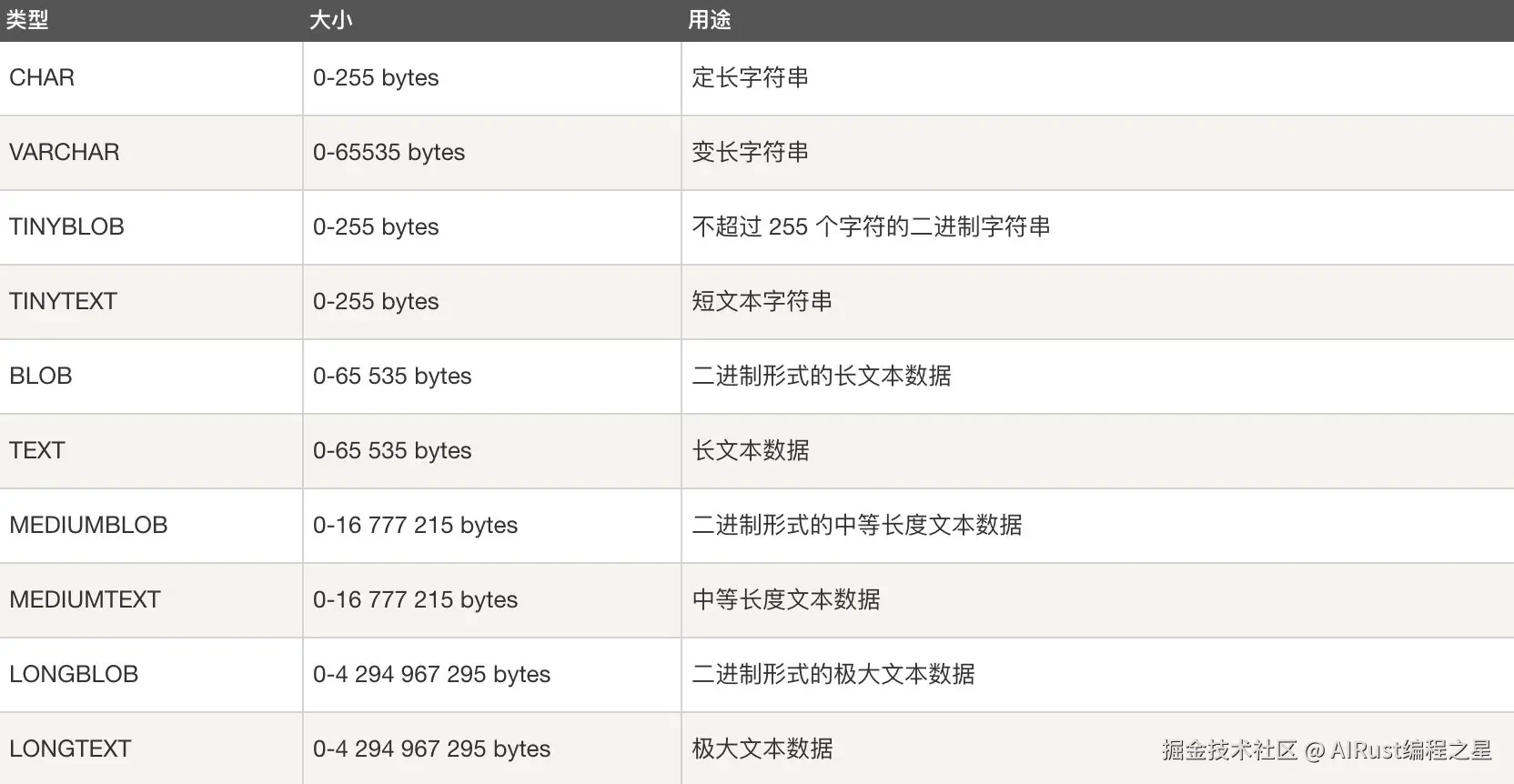 - 字符串类型:CHAR、VARCHAR、TINY TEXT、TEXT、MEDIUM TEXT、LONGTEXT、TINY BLOB、BLOB、MEDIUM BLOB、LONG BLOB