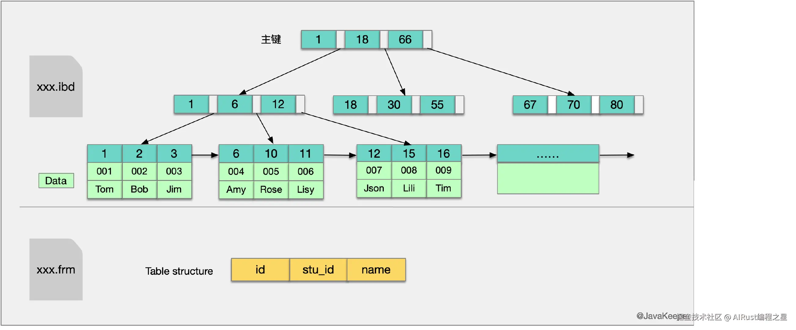 - InnoDB 是聚簇索引,MyISAM 是非聚簇索引。聚簇索引的文件存放在主键索引的叶子节点上,因此 InnoDB 必须要有主键,通过主键索引效率很高。但是辅助索引需要两次查询,先查询到主键,然后再通过主键查询到数据。因此,主键不应该过大,因为主键太大,其他索引也都会很大。而 MyISAM 是非聚集索引,数据文件是分离的,索引保存的是数据文件的指针。主键索引和辅助索引是独立的。