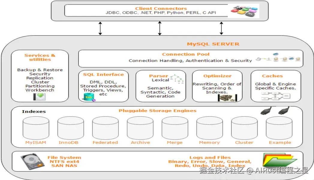 - 存储层:第四层为数据存储层,主要是将数据存储在运行于该设备的文件系统之上,并完成与存储引擎的交互