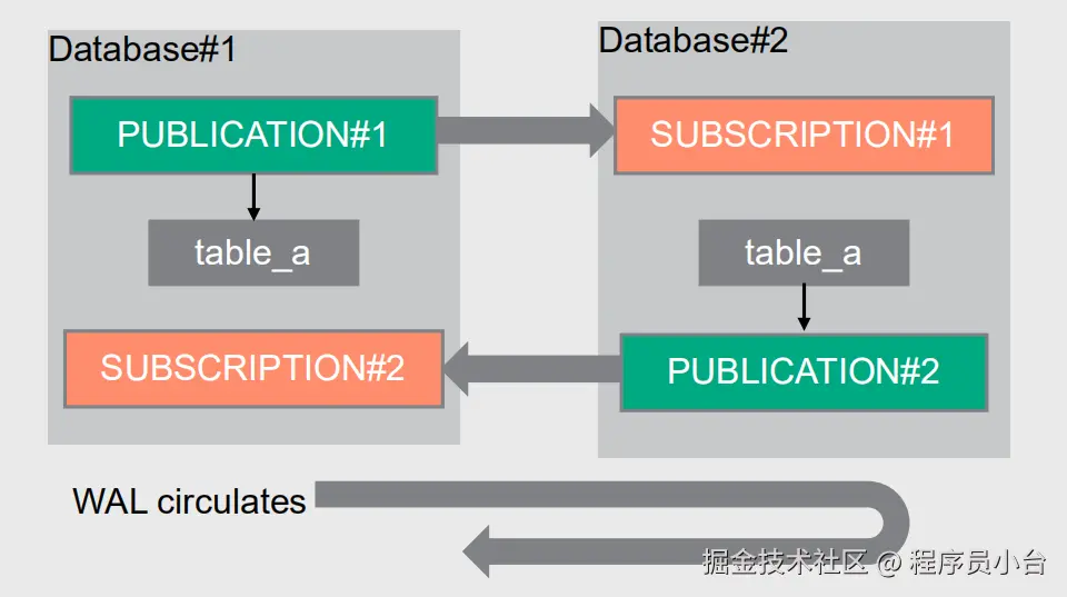 此时我在发布端插入一条数据就会出现环绕现像。此时就会出现循环。不停的从A复制到B,再从B复制到A,直到把数据库搞崩。双向复制需要使用不同的表来实现。使用同样的表会产生WAL循环。