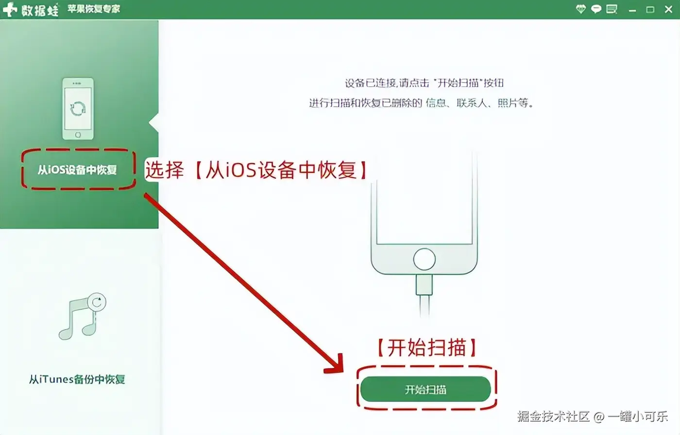 步骤1:选择数据恢复方式【从iOS设备中恢复】,然后点击【开始扫描】。
