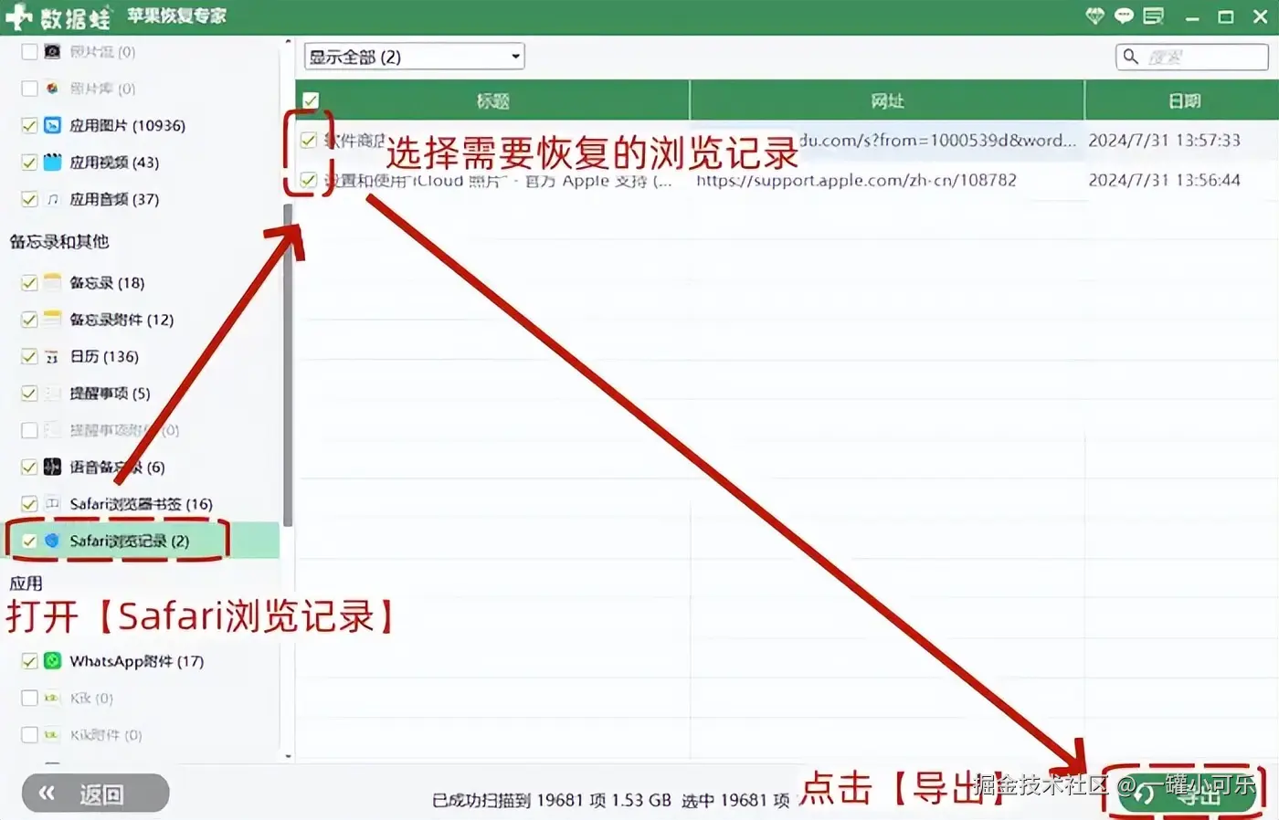 步骤2:扫描完成后,在软件界面中找到 【Safari浏览记录】 选项,预览并点击勾选你想要恢复的浏览记录,然后点击 【导出】 ,按照提示完成恢复过程。