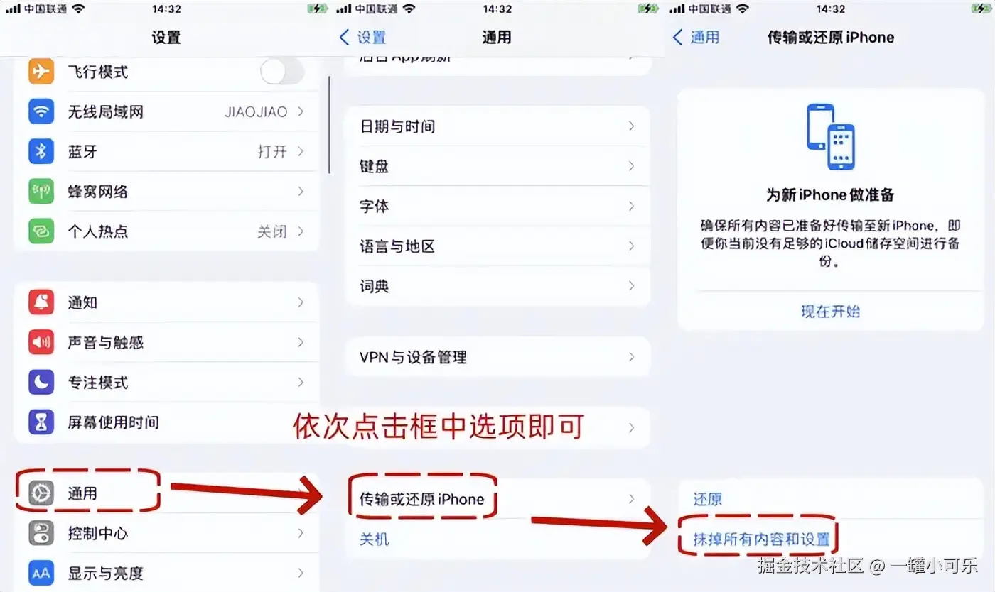 步骤2:在【设置】中选择 【通用】>【还原】>【擦除所有内容和设置】 ,然后重启手机等待数据恢复即可。