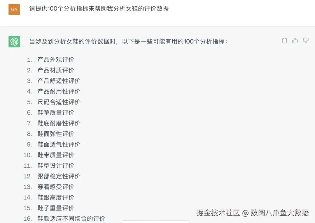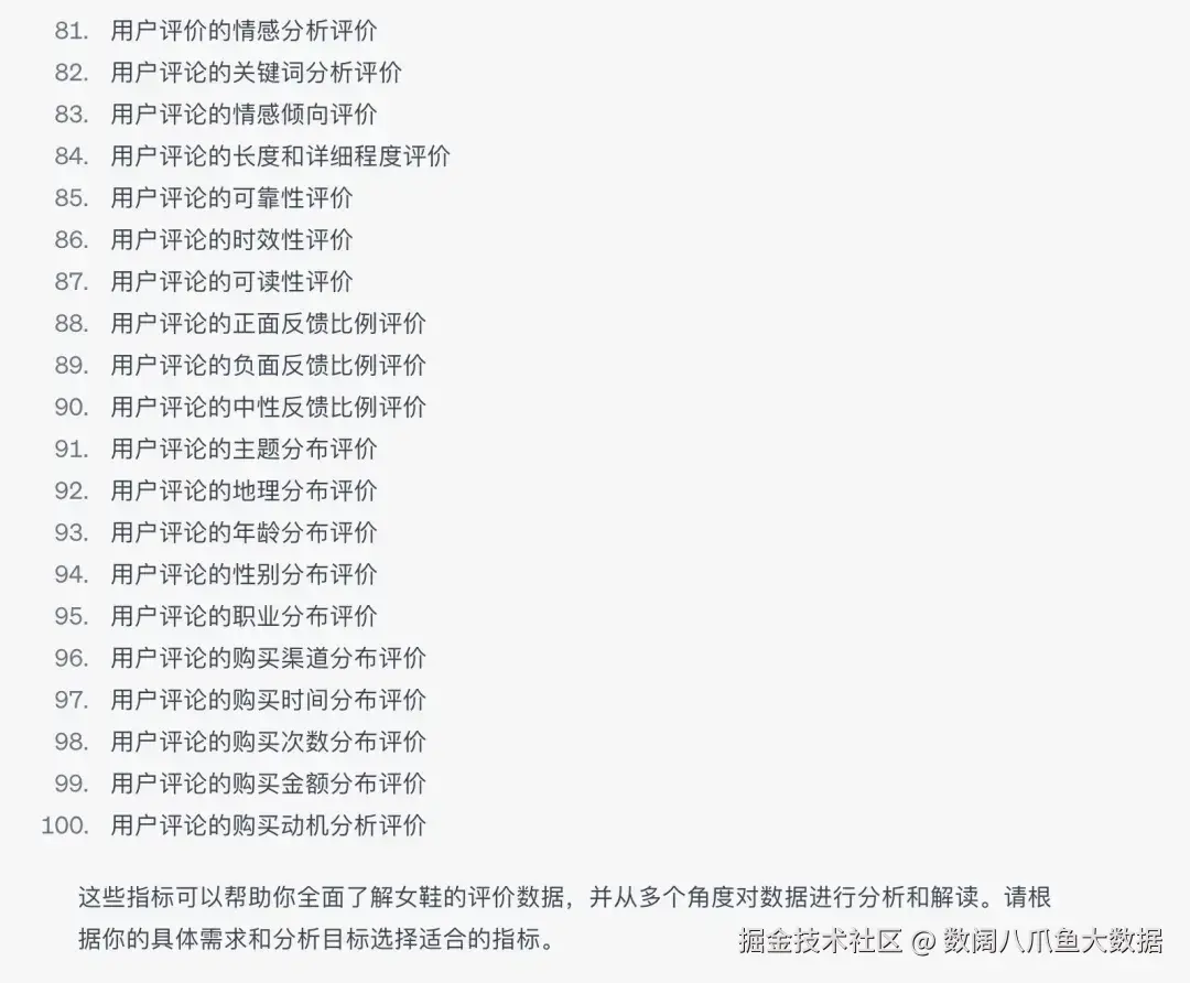 还可以有更详细的分析方法,比如让ChatGPT提供100个指标维度分析商品评论: