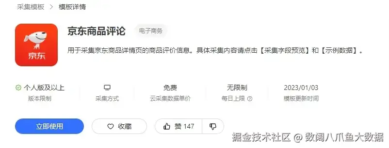 采集过程小八就不详细展开啦,八爪鱼客户端里有京东评论的采集模板,只需输入商品链接就可以“一键”采集评论数据~