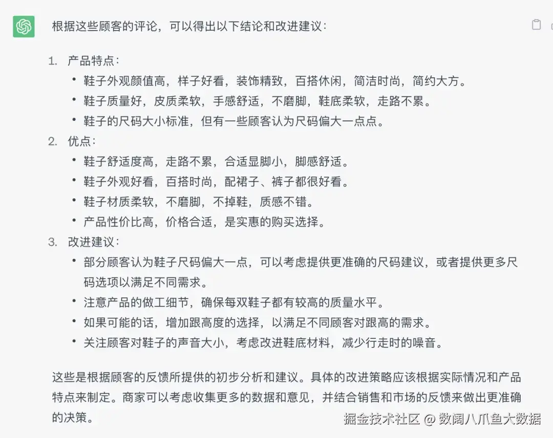 将评论数据发给ChatGPT后,我们还可以继续追问,比如问它对于商品的改进建议。