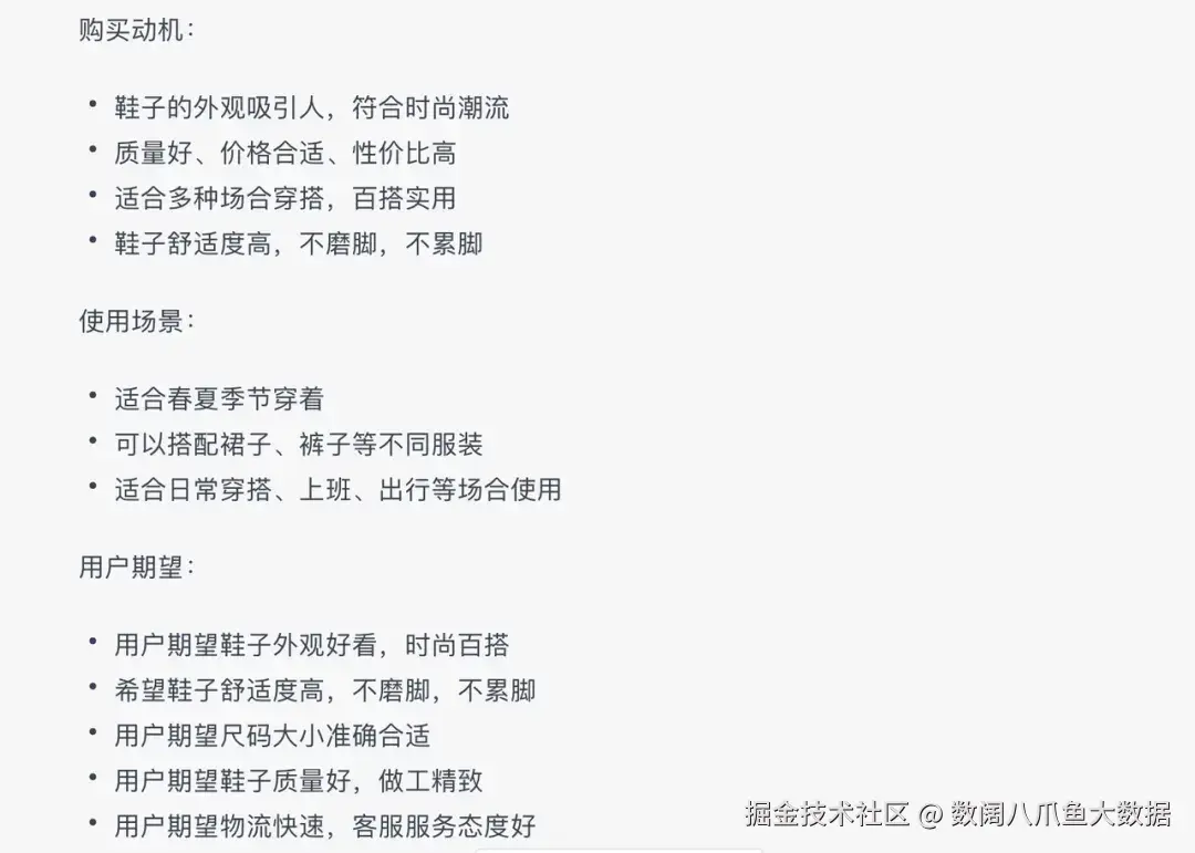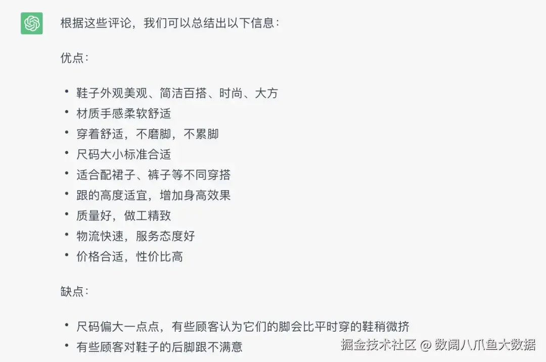 将评论信息发给ChatGPT,让它分别总结产品的优点、缺点、购买动机、使用场景和用户期望。