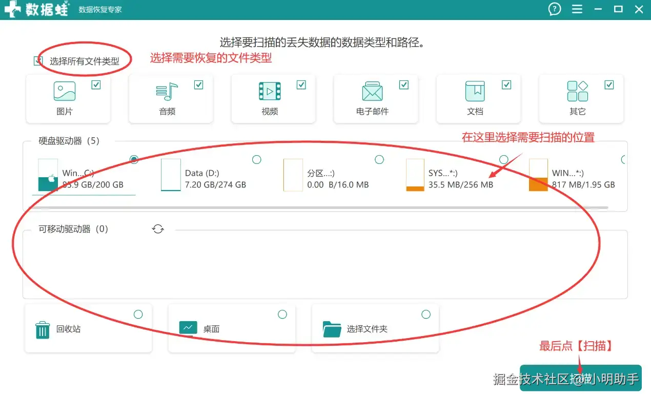 步骤1: 在电脑里面启动数据 蛙恢复专家,进入后选择自己需要恢复的文件类型,然后再点击需要进行扫描的位置,最后才用鼠标点【扫描】。