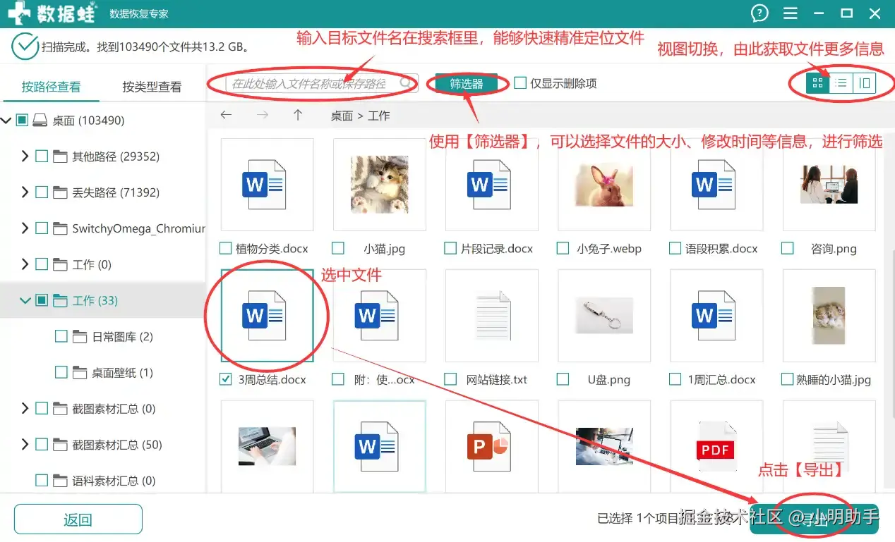 步骤2: 耐心等候软件扫描完毕后,选择需要恢复的文件(可以借助【搜索框】、【筛选器】等工具进行目标文件的搜索),然后选定文件,点击【导出】。