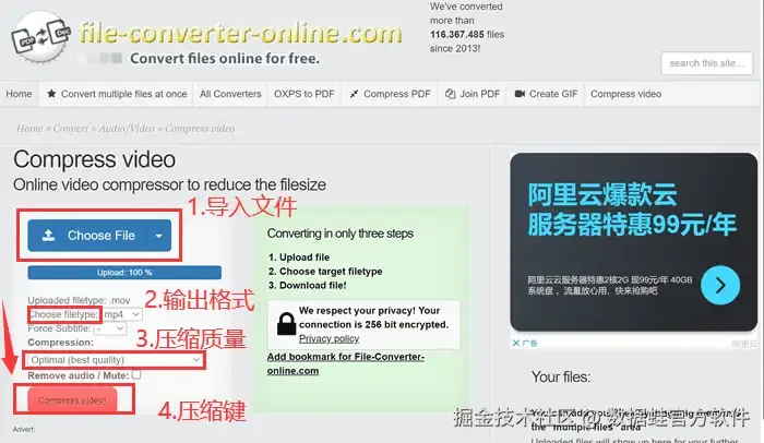 File converter online提供了免费的视频压缩服务,是一款在线视频压缩服务平台。这种平台的特性就是无需下载任何软件,可以跨系统和设备地对视频文件进行压缩操作,非常方便。除了视频压缩外,File Converter Online还支持多种文件格式的转换、编辑和压缩,包括文档、图像、音频等,为用户提供了全面的文件处理服务。