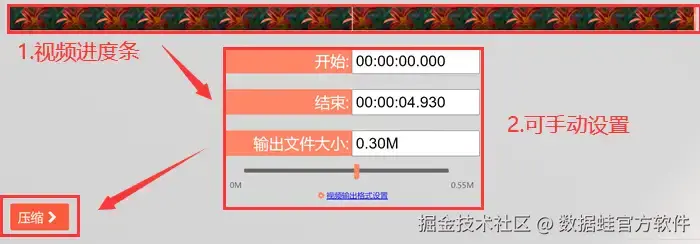 第二步: 在 【开始】 和 【结束】 的数字框内手动设置截取的视频段,或者直接拖动一下的进度条中的滑块,选择压缩视频的大小。