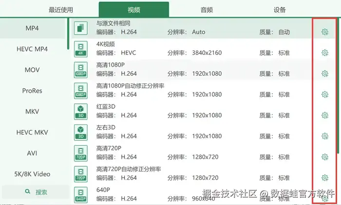 第二步: 点击任务栏隔壁的设置图标,在设置视频输出格式的同时,按需选择输出质量,若您觉得这些选项都不满意,也可以点击 【齿轮】 图标自定义输出质量。