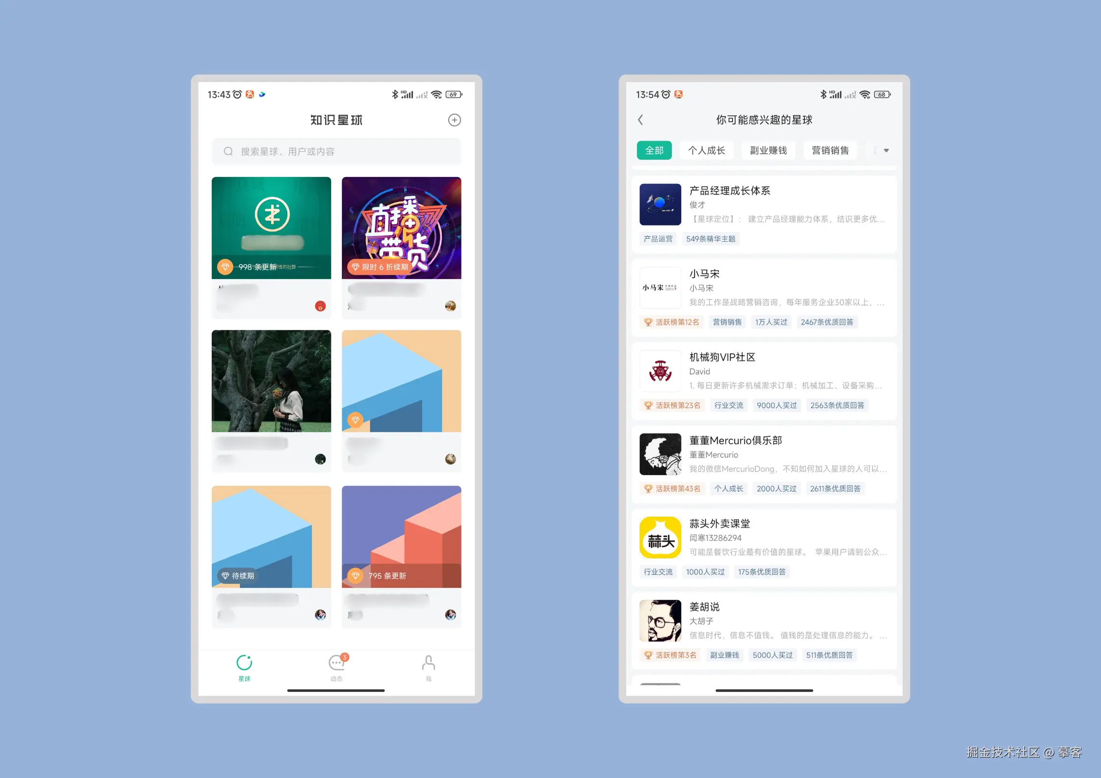 知识星球是一款付费社群产品,它也采用了卡片式设计,每一张卡片代表一个星球(即社群),卡片的视觉设计简洁而直观,内容仅包含星球的logo、名称和星球创建者头像及名字。通过这种模块的呈现方式,用户可以快速找到想要参与的社群,大大提高了效率。
