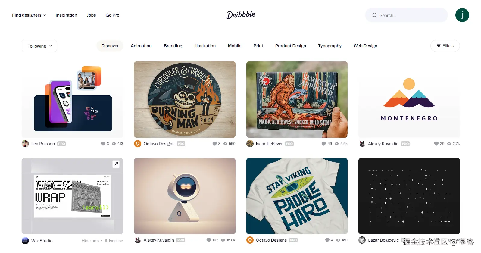 设计师都知道的Dribbble网站,就很好地运用了卡片式UI设计。它的首页展示了大量的卡片,每张卡片都是一个设计作品,卡片包含该作品的预览图、标题、点赞数和评论数等关键信息。