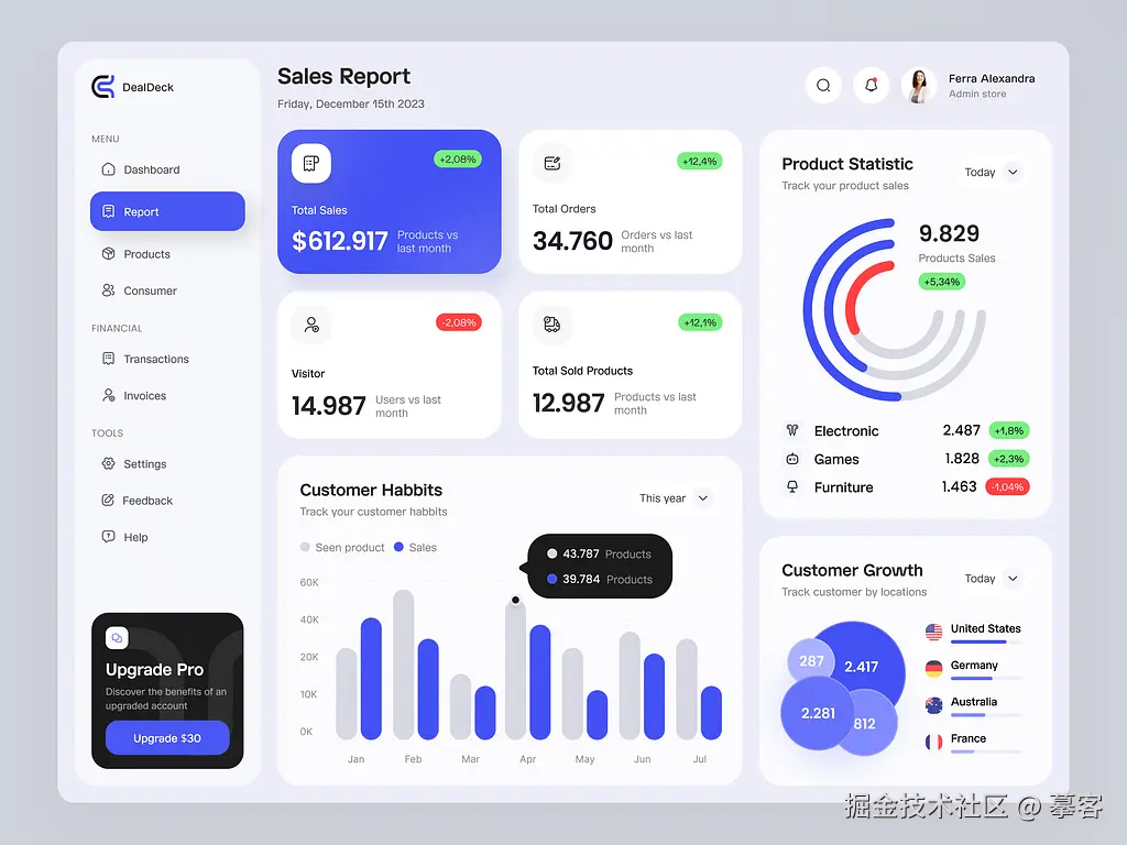 仪表盘(Dashboard)是展示数据和关键指标的重要工具,卡片式UI设计在其中得到了广泛应用。这种设计将每个数据块或指标呈现在独立的卡片中,帮助用户在视觉上分隔不同的数据类型,使得信息展示更加直观和模块化。
