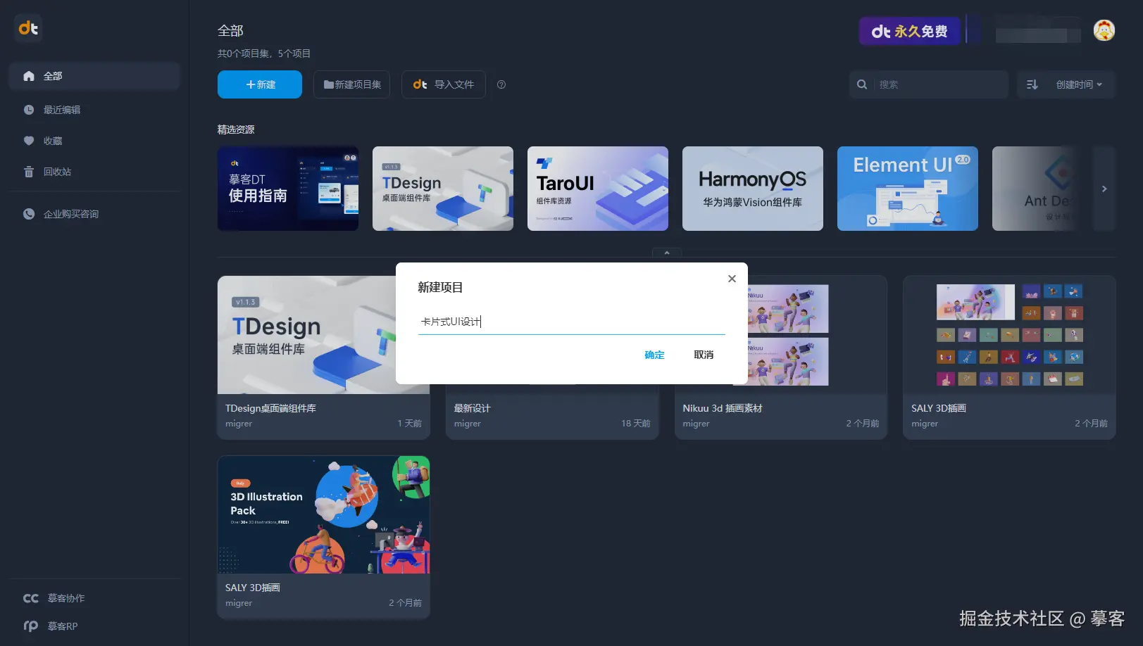 注册并登录摹客DT(www.mockplus.cn/dt),新建设计项目,填写项目名称。