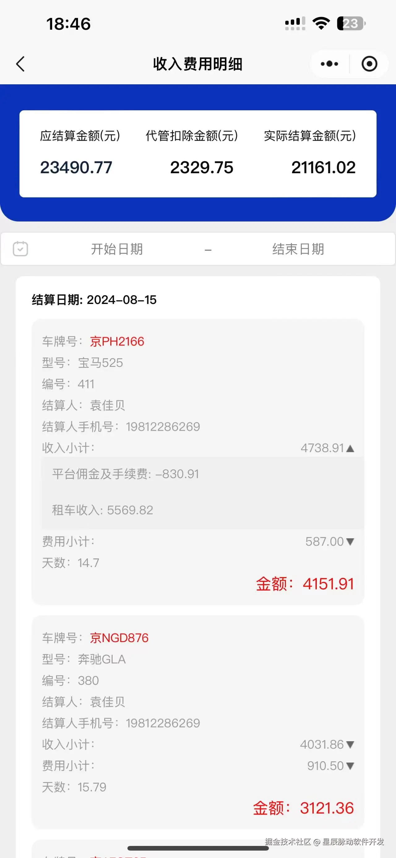 适合在店铺代管车辆的用户使用,可查看应结算金额、代管扣除金额、实际结算金额、可根据日期筛选结算信息、结算信息包括车辆的收入、支出等。