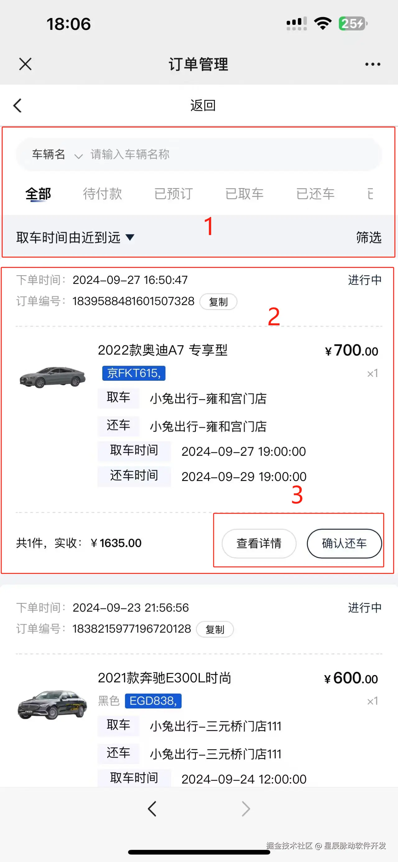 2.展示车辆订单的信息:车辆信息、价格、时间、取还车地址、车牌号、金额、总金额