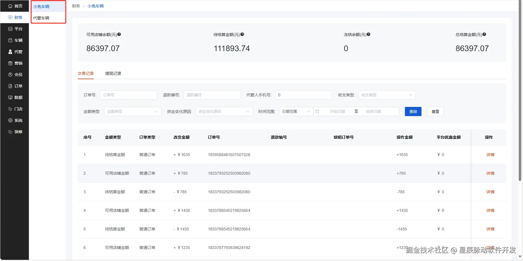 可查看店铺的余额信息、交易记录、提现记录、可通过订单号时间范围,代管人手机号进行查询