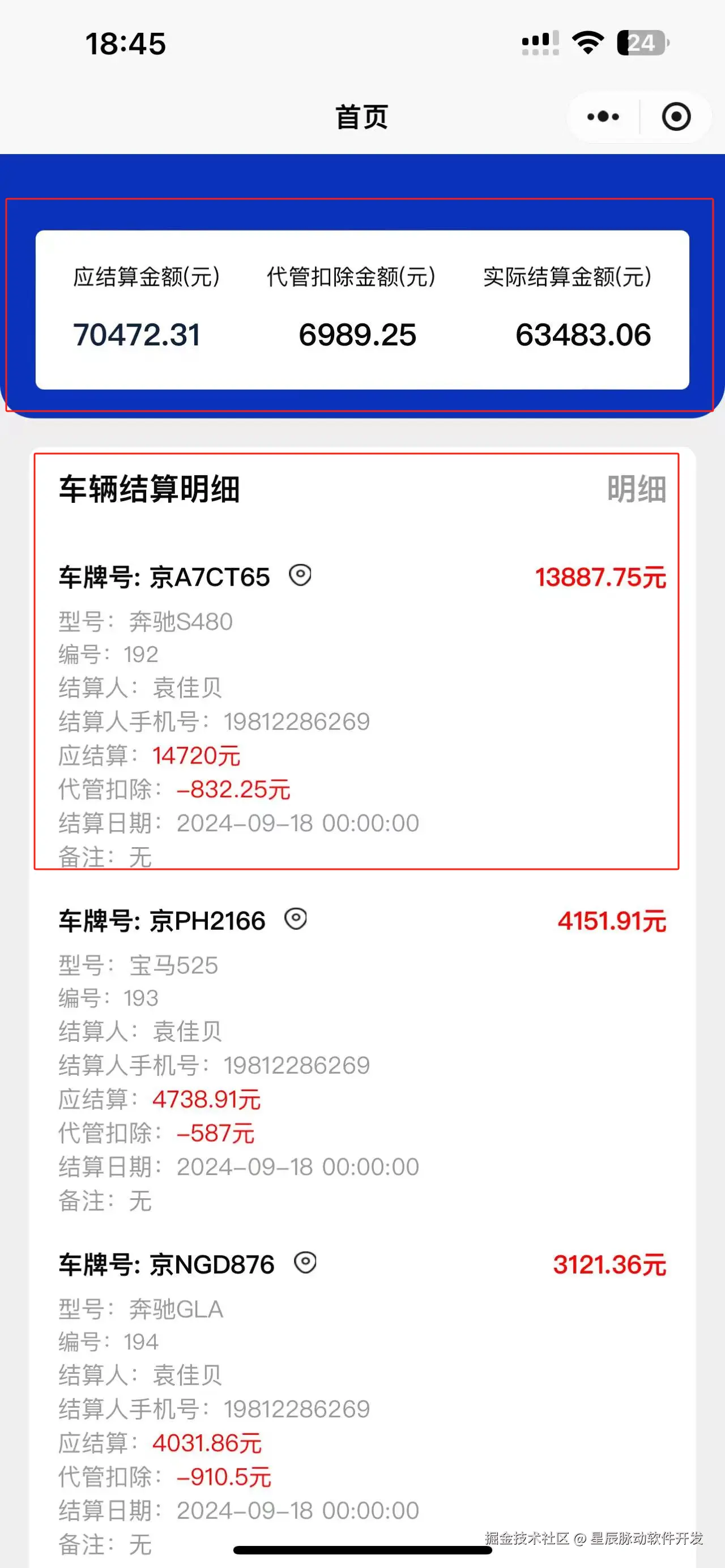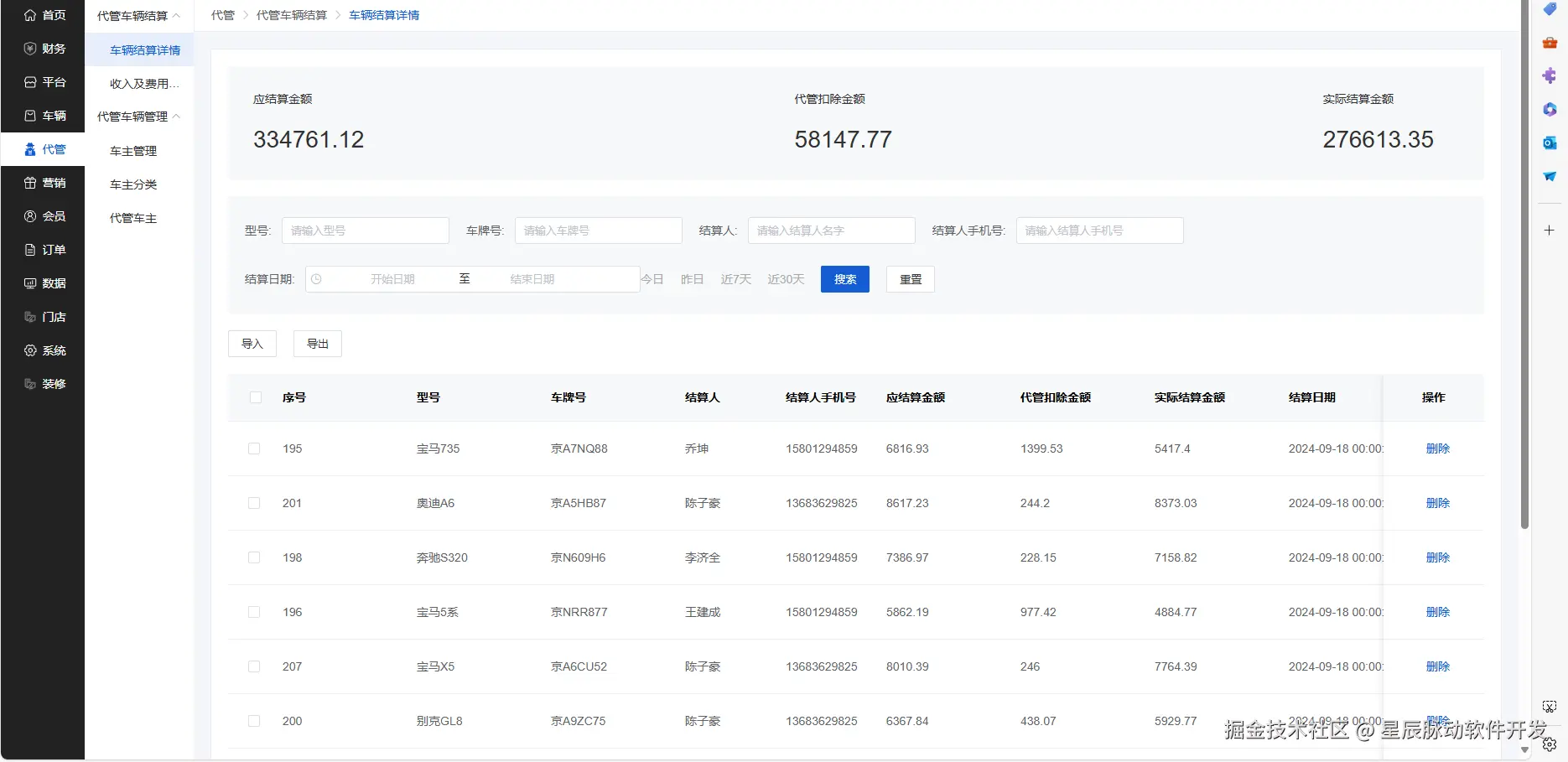 查看代管总结算金额、代管扣除金额、实际结算金额、车辆结算明细