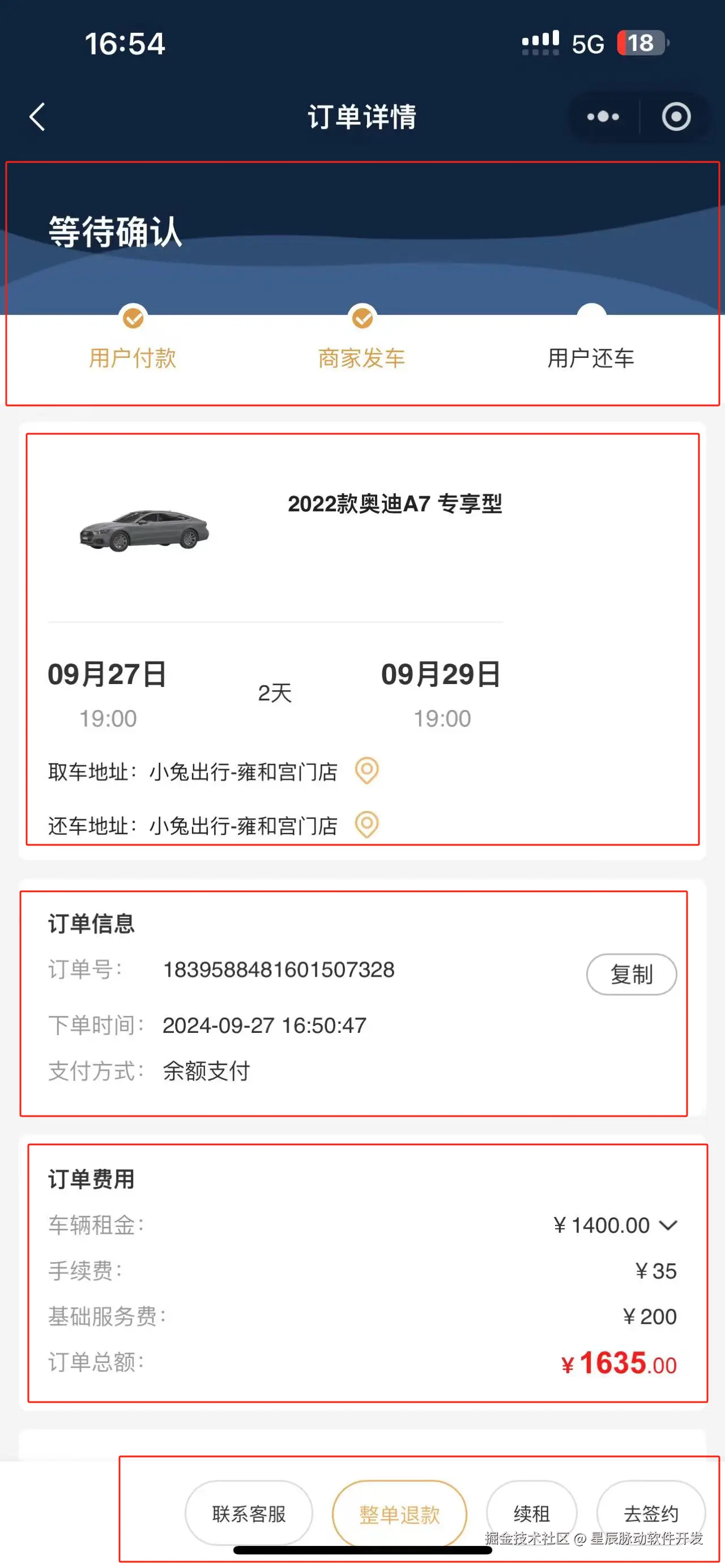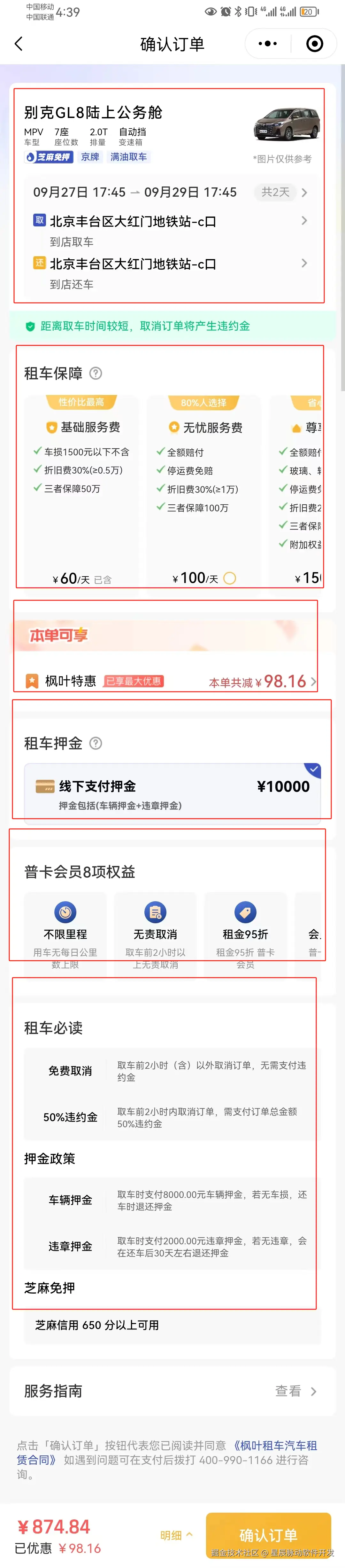 展示下单信息:车辆信息、取还车地址、时间、订单号、支付时间、方式、订单费用等