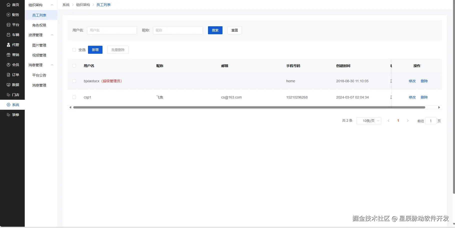 系统:添加、删除、修改员工、角色权限、资源管理、消息管理